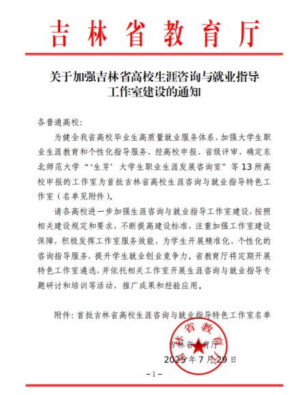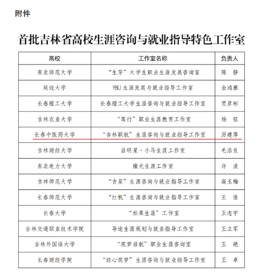 近日,吉林省教育厅发布《关于加强吉林省高校生涯咨询与就业指导工作室建设的通知》,我校“杏林职航”生涯咨询与就业指导工作室凭借完备的设施、扎实的服务,成功入选首批吉林省高校生涯咨询与就业指导特色工作室,成为全省13所获此殊荣的高校之一。